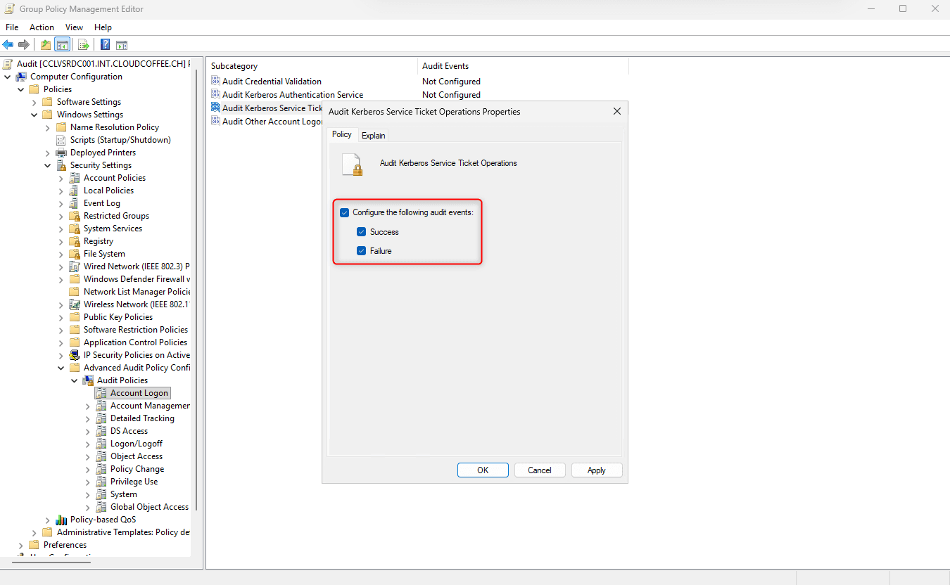 Computerkonfiguration > Richtlinien > Windows-Einstellungen > Sicherheitseinstellungen > Erweiterte Überwachungsrichtlinienkonfiguration > Überwachungsrichtlinien > Kontoanmeldung > Ticketvorgänge des Kerberos-Diensts überwachen aufrufen