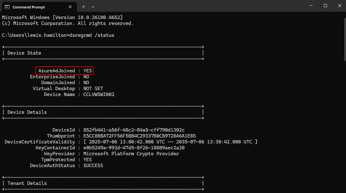 Alle Geräte sind Microsoft Entra joined oder Microsoft Entra hybrid joined. Der Status lässt sich unter anderem mit folgendem Befehl prüfen: