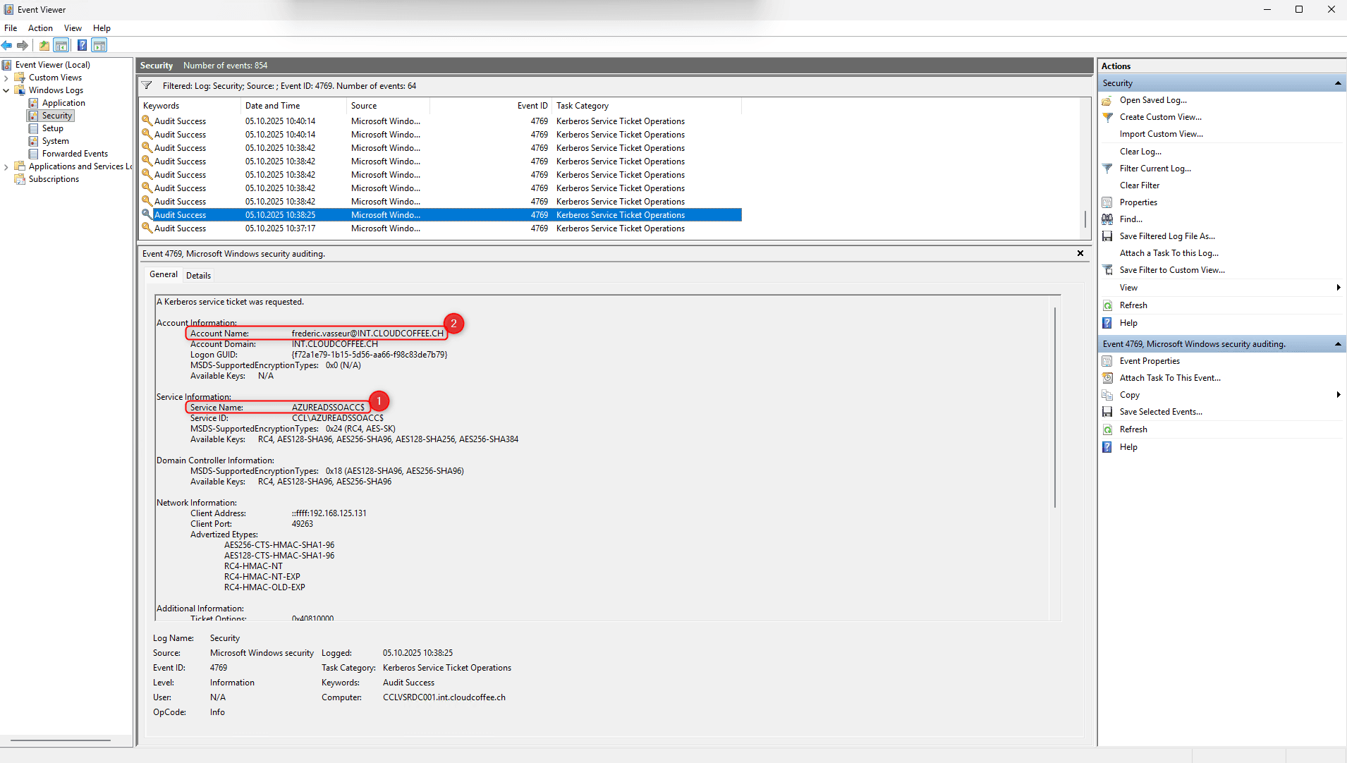 Nach einigen Tagen kann die Ereignisanzeige unter Windows-Protokolle > Sicherheit nach der Ereignis-ID 4769 gefiltert werden. Einträge mit dem Dienstnamen AZUREADSSOACC$ (1) weisen auf die Verwendung von nahtlosem Single Sign-On (Seamless SSO) hin. Der jeweilige Benutzer wird im Feld Kontoname (2) aufgeführt.