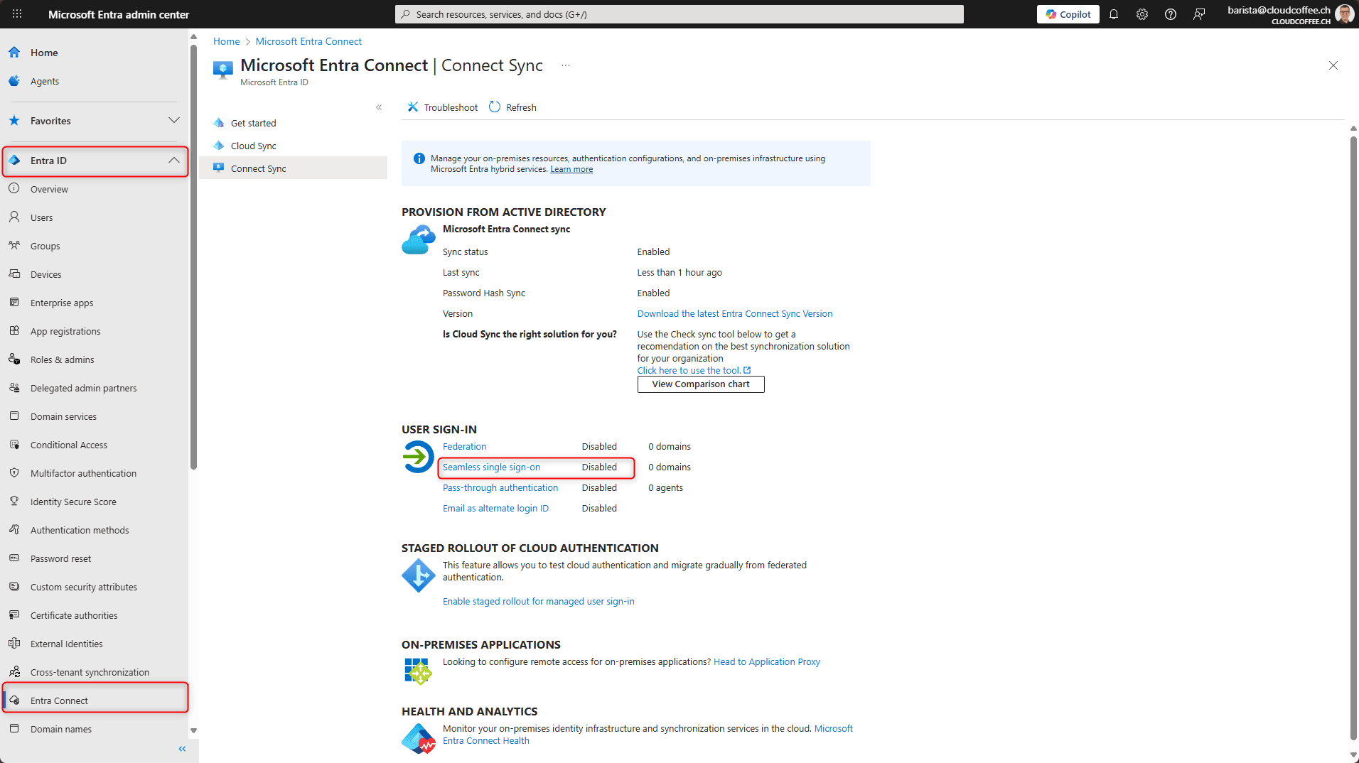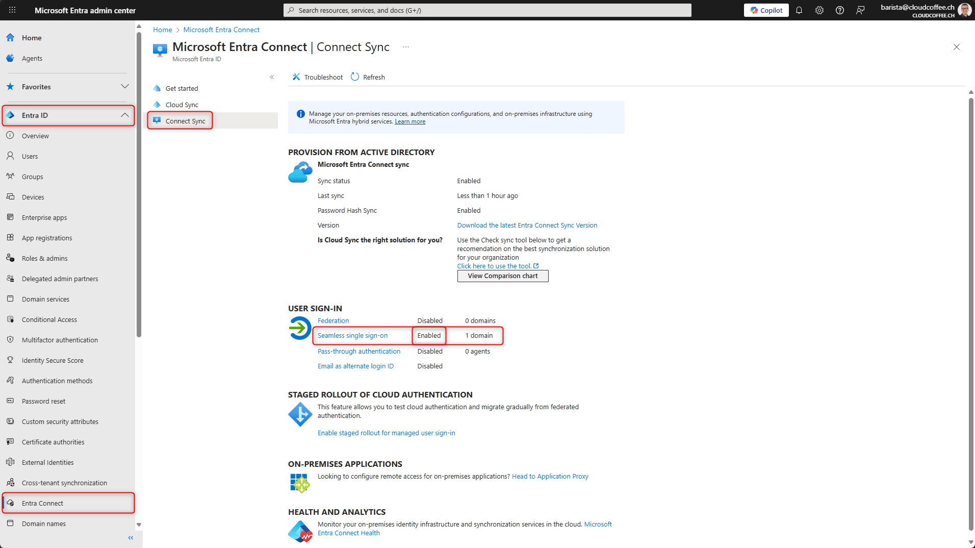 Microsoft Entra Connect ist mit der Funktion nahtloses Single Sign-On (Seamless SSO) konfiguriert.